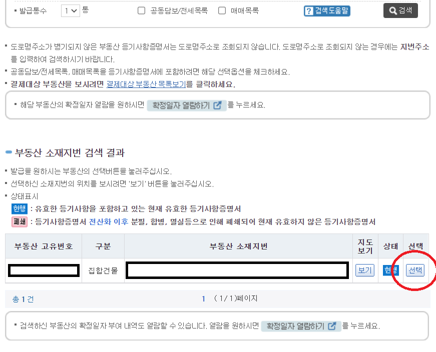 그럼 해당 부동산의 소유자 정보가 나오는데 한번더 선택을 누르세요.